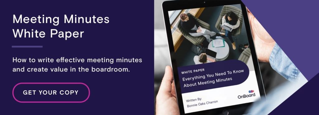 Meeting minutes are important for all boards for myriad reasons. As such, taking minutes at a board meeting isn’t a task to be taken lightly. Instead, the board secretary (or whomever is responsible for taking board meeting minutes) should make it a priority to draft clear, concise meeting minutes that serve as an accurate record of what happened during a board meeting.