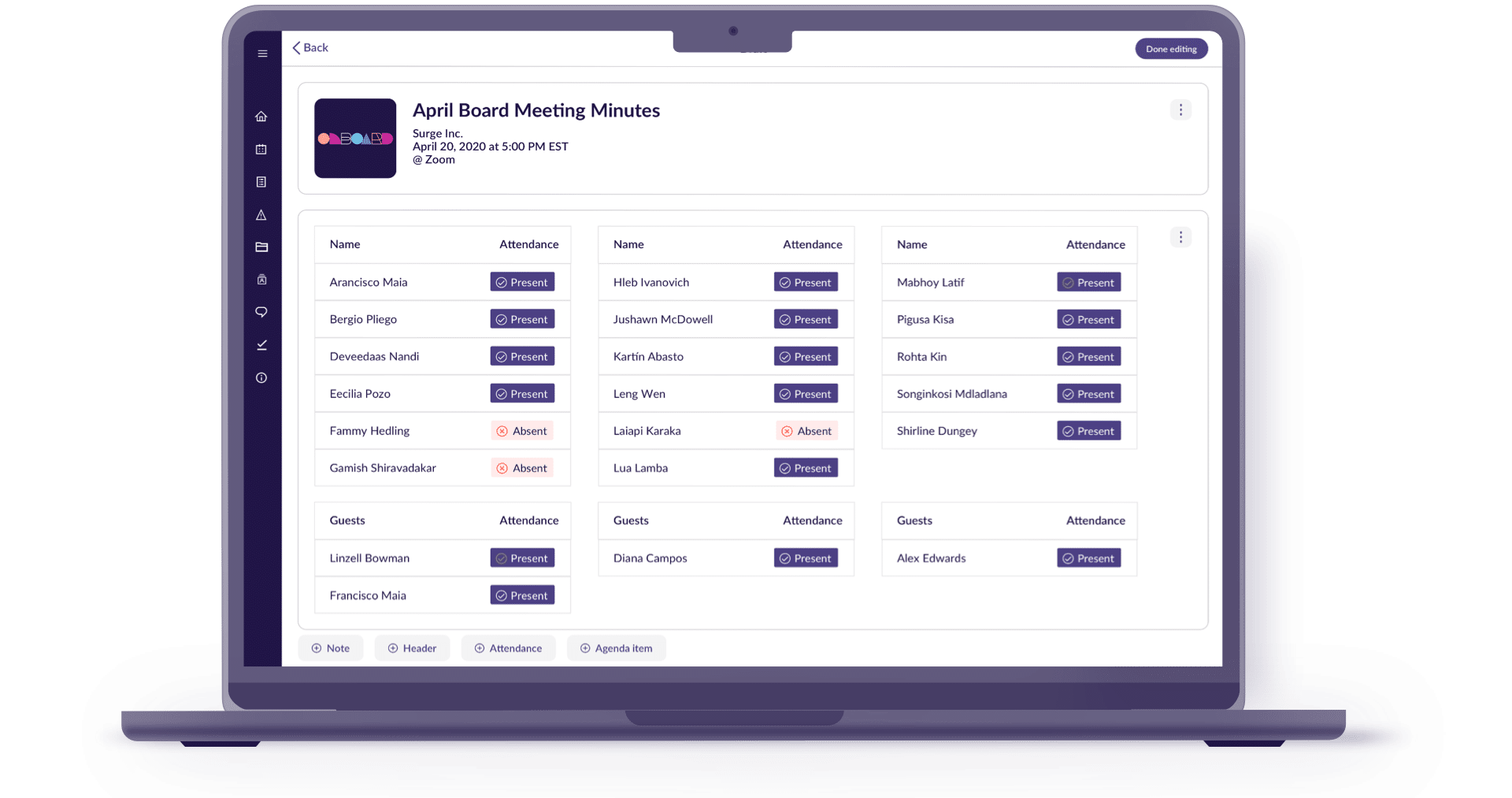 Keep minutes aligned to the agenda so nothing gets lost. Tap to mark attendance, add sections on the fly, and mirror the order of discussion—so edits are faster and the final stays consistent with the book.