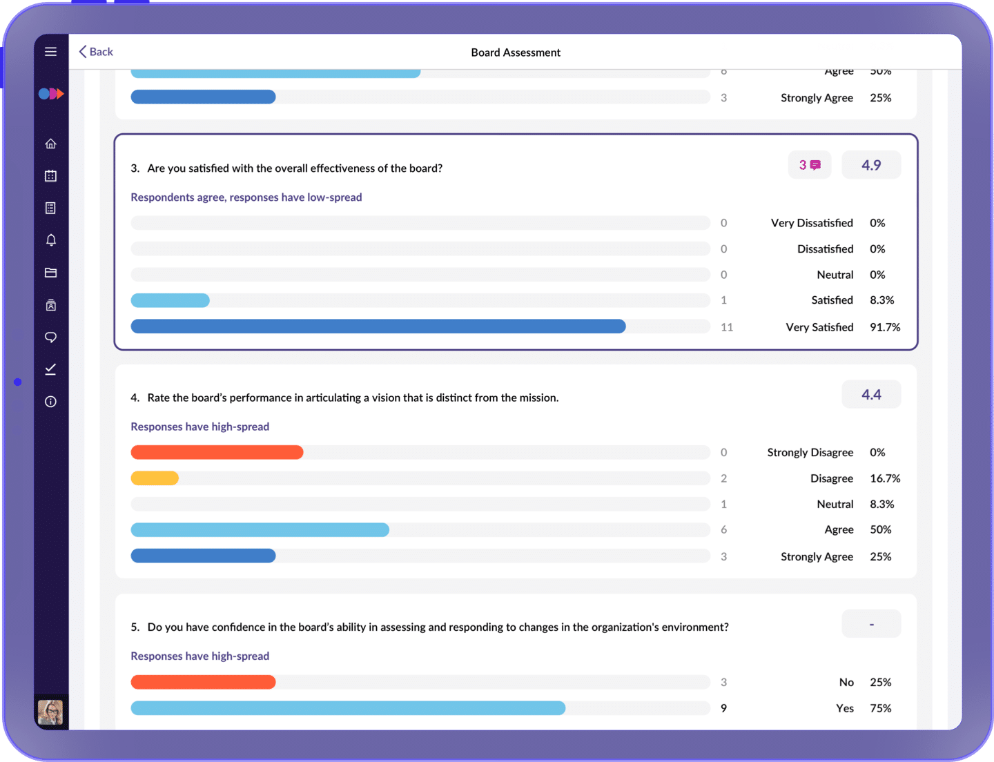 OnBoard's Board Assessments translate performance data into growth opportunities, equipping you with the insights needed for continuous governance enhancement.