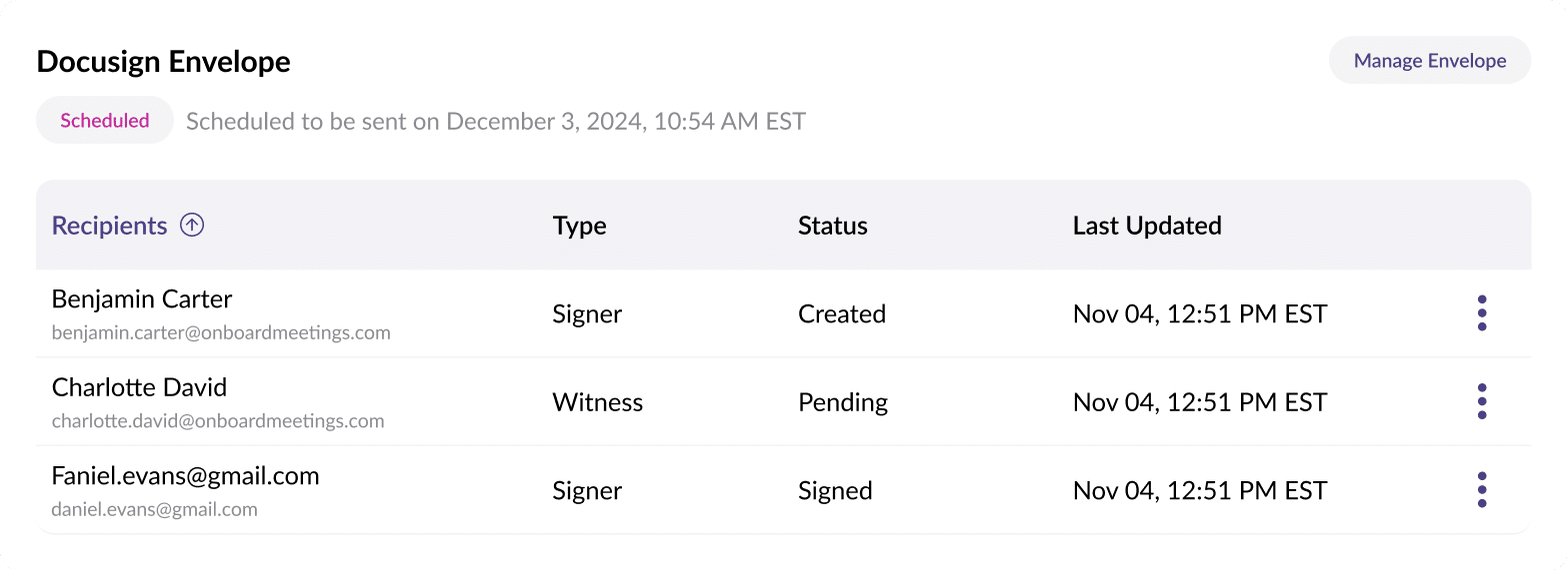 Prepare, send, and manage envelopes without leaving OnBoard. Your documents, directory, and signature requests all live in one seamless environment—no third-party tools required.